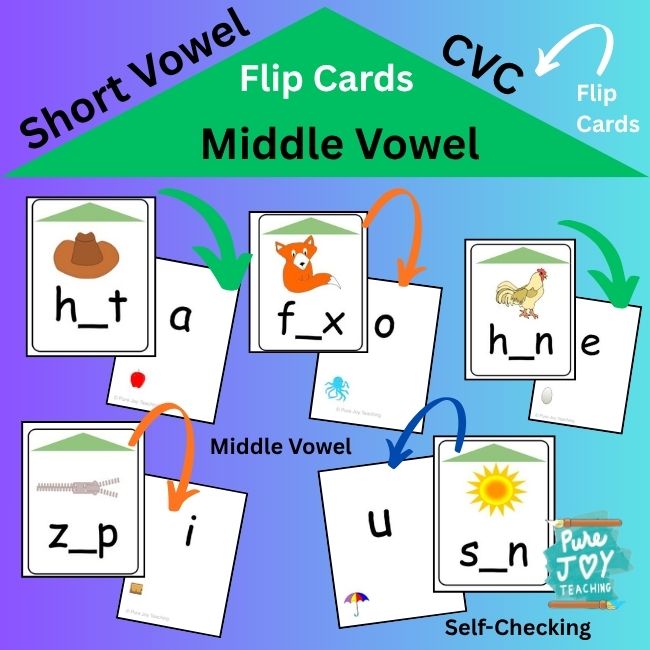 Flip Cards cvc middle vowel pure joy teaching Short vowel practice cvc Flip Chute cards Short vowel practice cvc Flip Chute cards by Pure Joy teaching